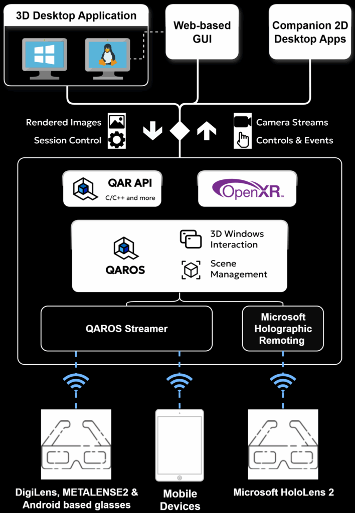 You can mix devices in a single session: AR and VR headsets, 3D displays, desktops, and tablets, all synchronized through the QAROS runtime.